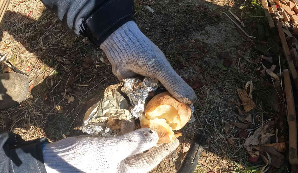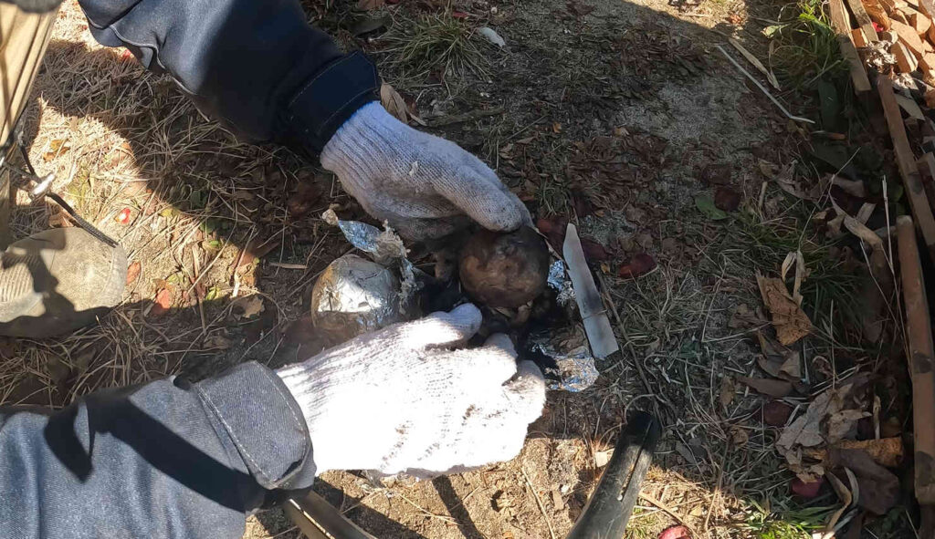 前回はまだ火力がそこまで落ちていないタイミングで適当に放り込んでしまったので、ちゃんと熾火のできていない場所に落とし込んでしまった結果、あまり火が通っていないイモができていたのかもしれません。