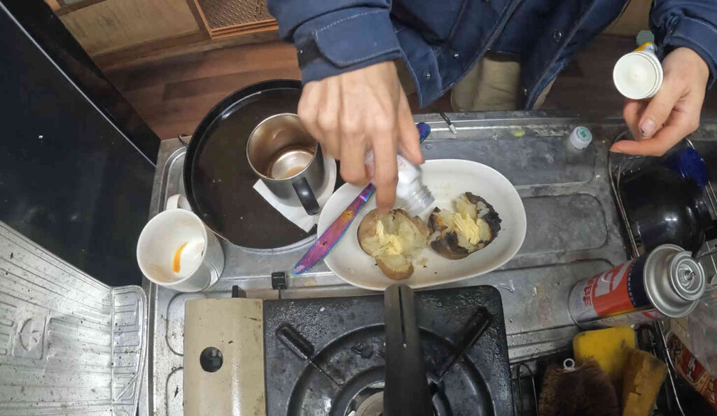 その後、芋にバターと塩をかけて味付けし……