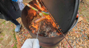 勢いよく燃えだしたらすかさず鐵串に刺したウィンナーを火に当てて焼きます。