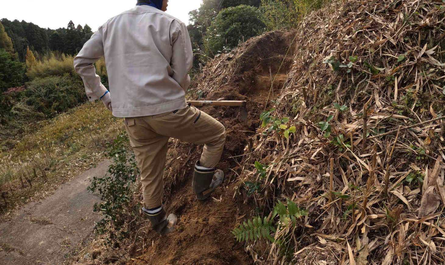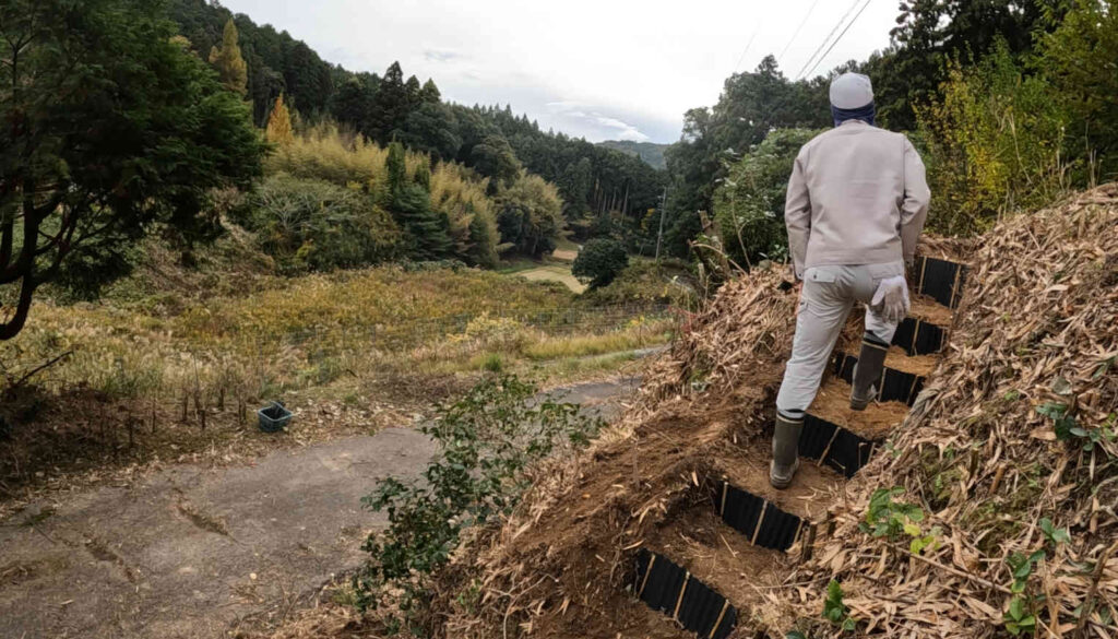 前回は、竹藪を開拓してまっさらになった傾斜地を掘って、階段の形にして、道路から土地に入るショートカット路を作っていきました。