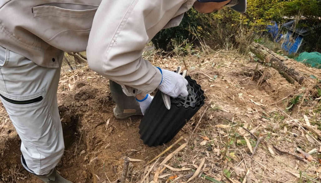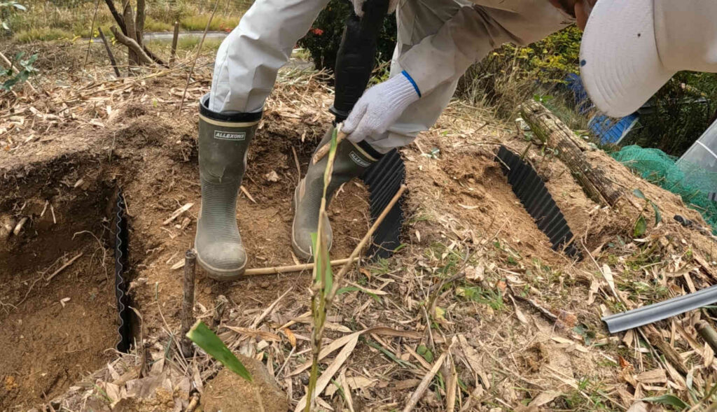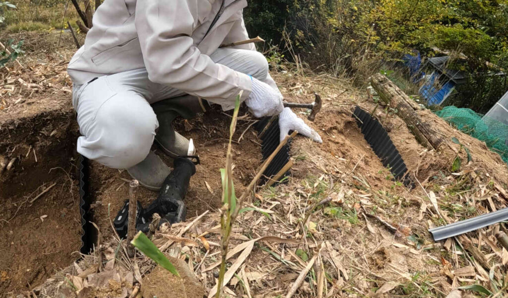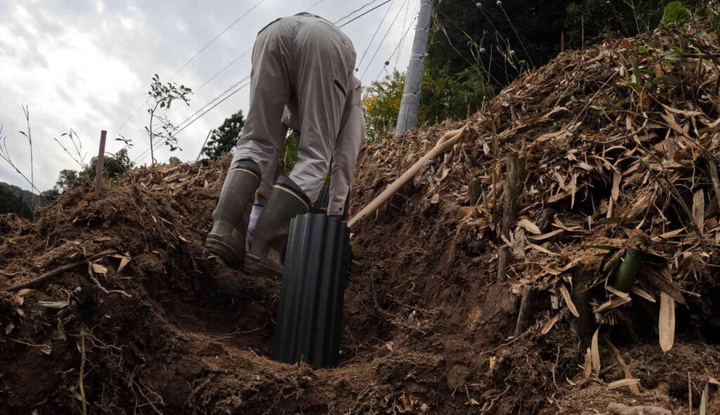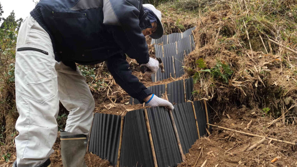 あぜ波シートの固定には、竹を斜めにカットして作った「竹杭」を使っていきました。