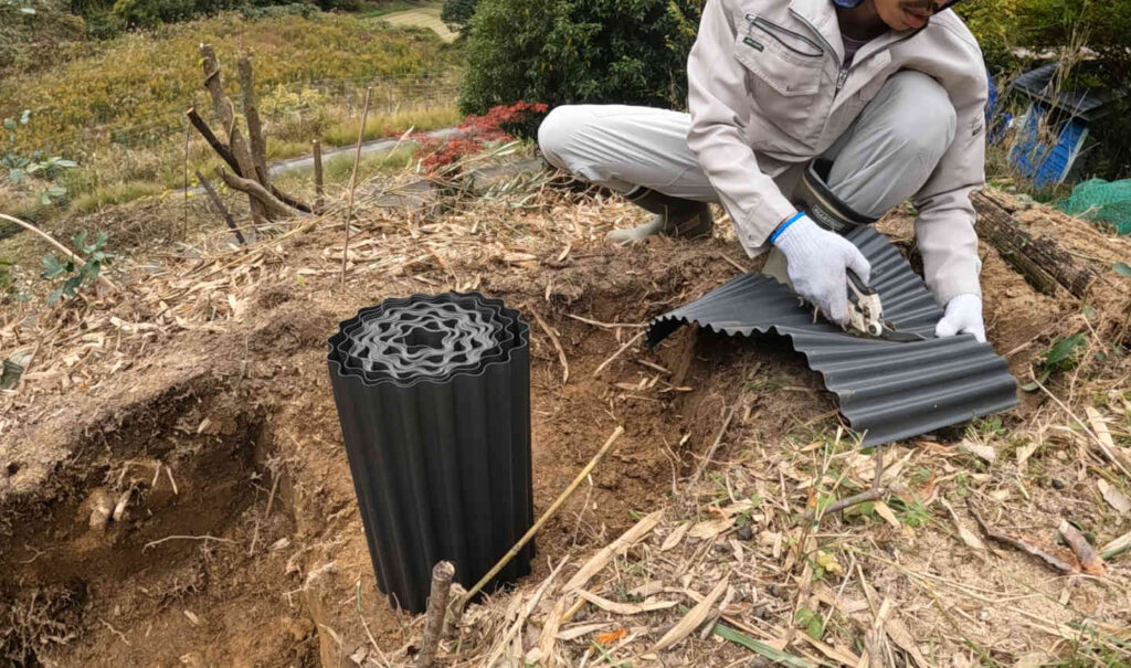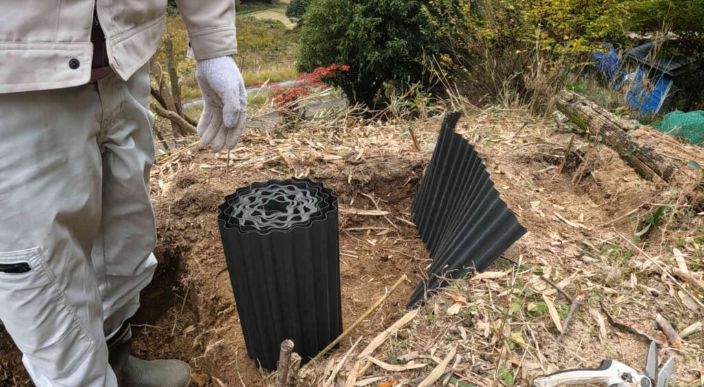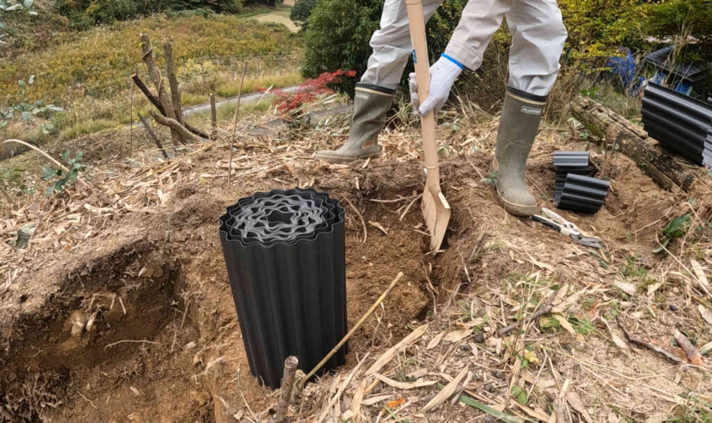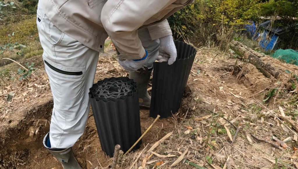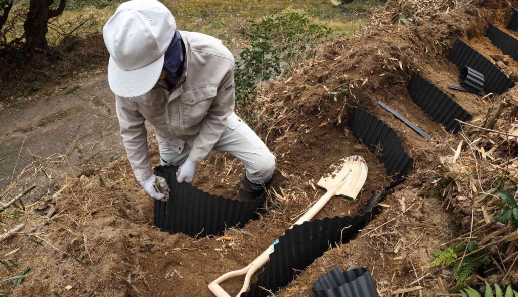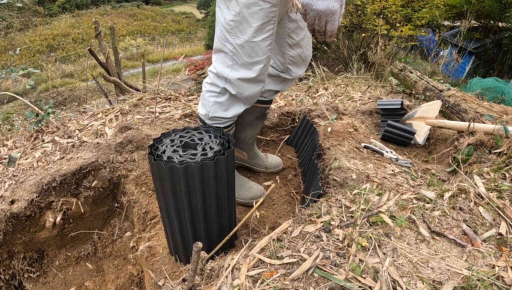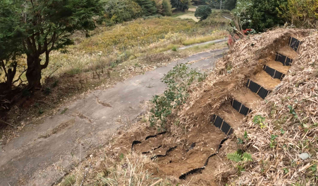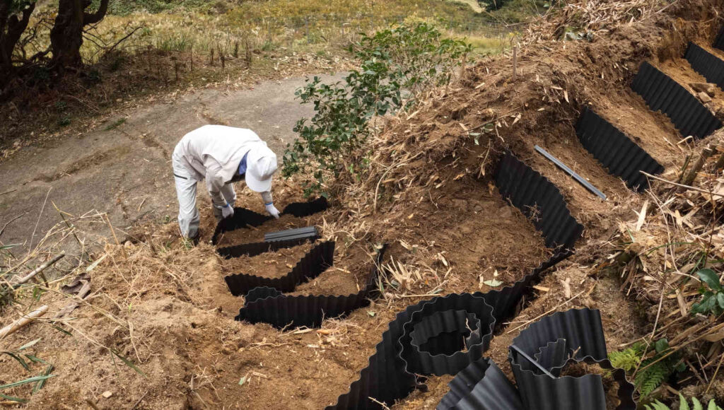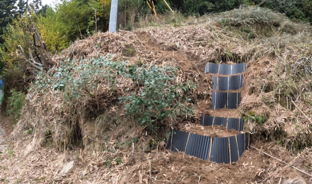 こちらは本来、田んぼのあぜに設置して補強するための資材なのですが、斜面際に設置して土留めにする使い方も良くされています。