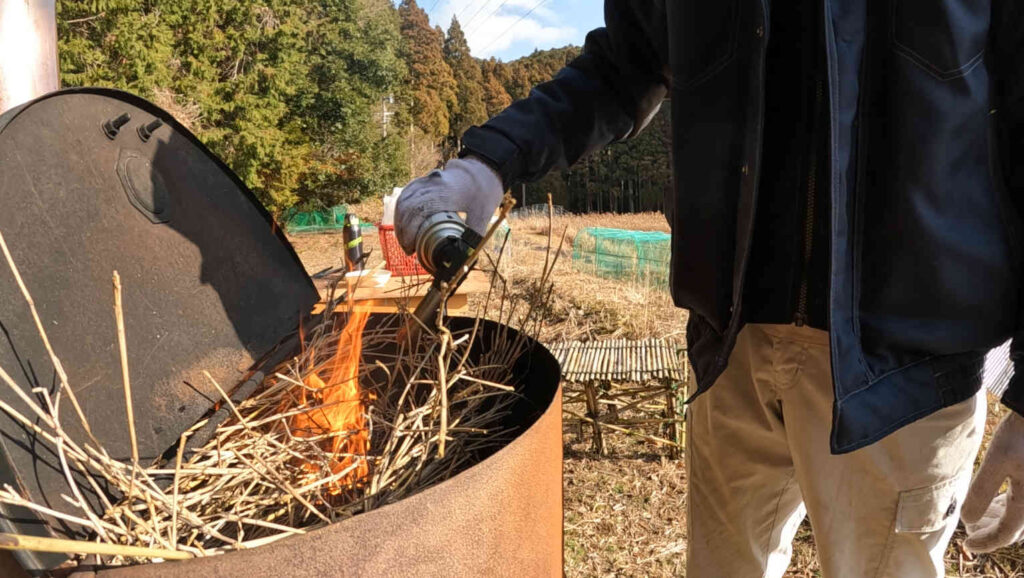 前日と同じく、まずは焼却炉の中に竹をパンパンに詰めてバーナーで着火していきました。