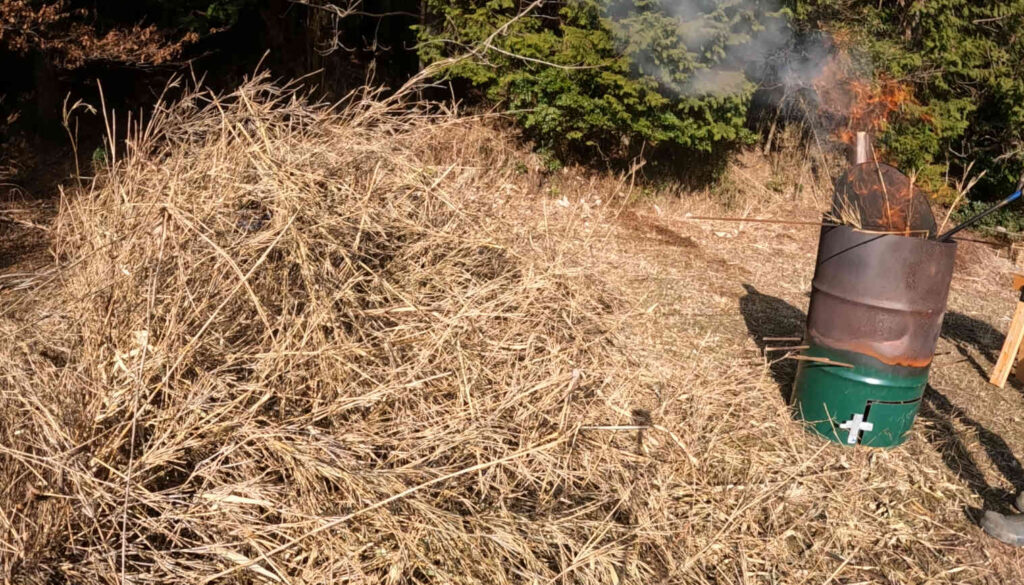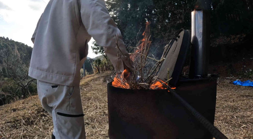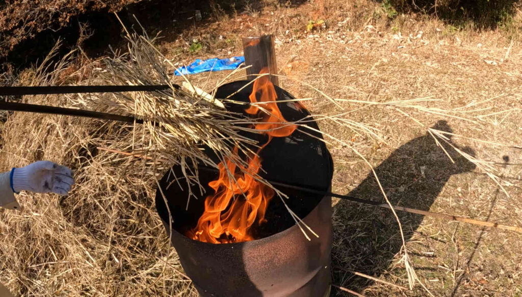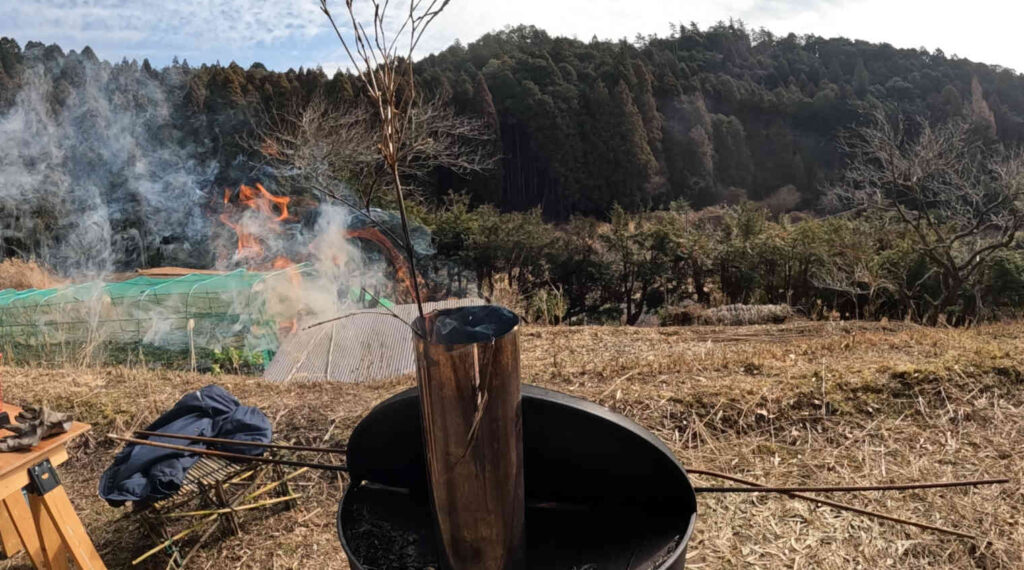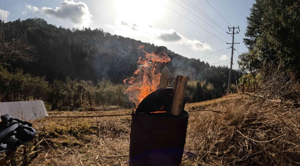 今回は、開拓した際に伐採した竹の、剪定時に出た大量の竹枝を焼却炉で燃やし尽くしていく様子をお伝えしていきました。