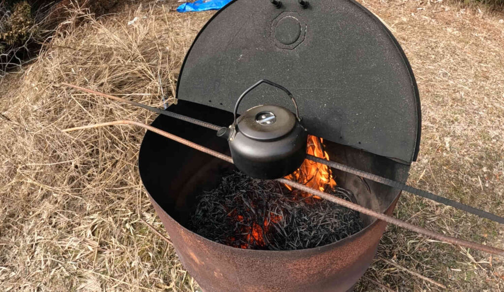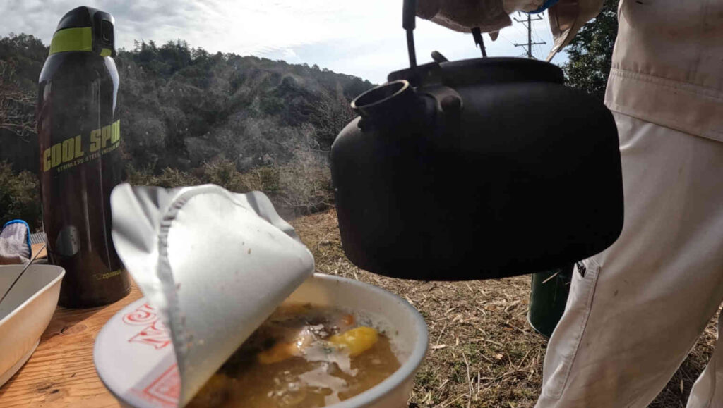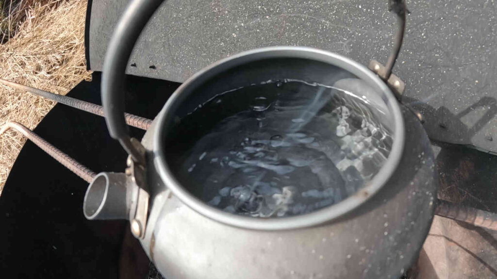 お昼頃になるとお腹が空いてきたので、この火はカップラーメンを食べるためケトルを火にかけてお湯を沸かしていきました。
