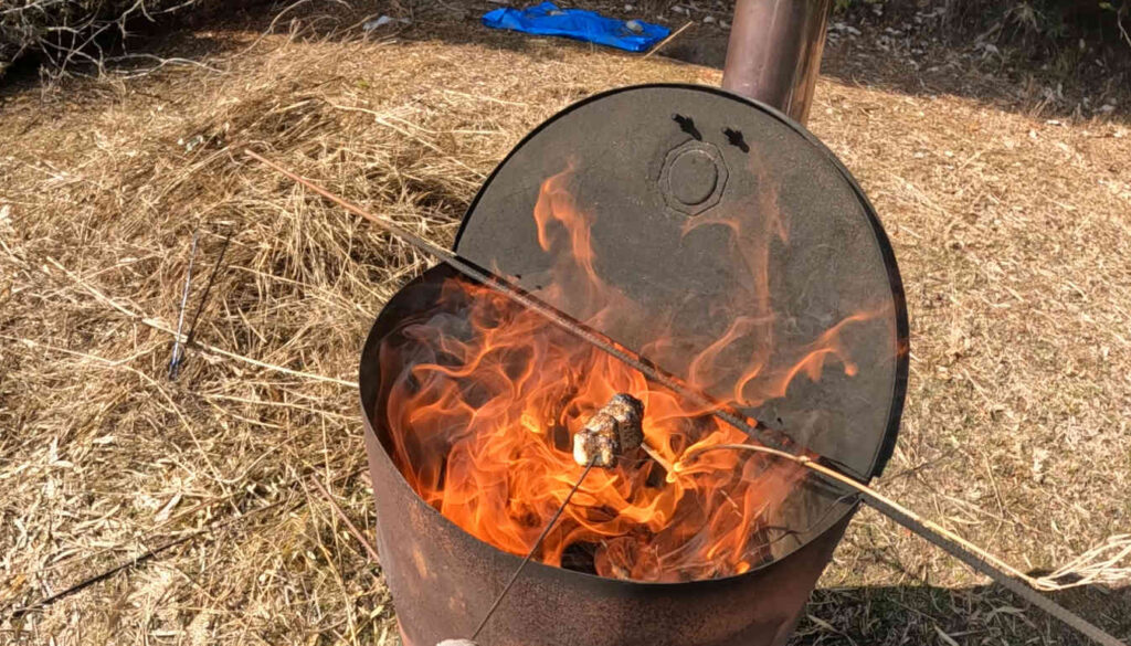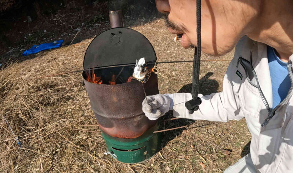 食後にはもはや焼却炉BBQで恒例となった焼きマシュマロを食べました。