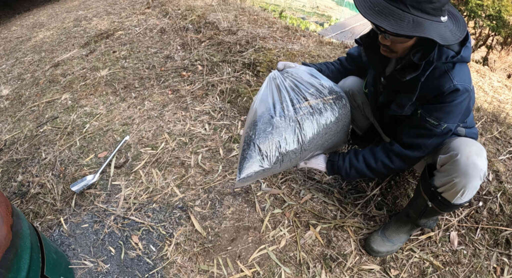 その後熱が引いた灰を全て回収して、ビニール袋に詰めていきました。これまで焼却炉を使用した中でもぶっちぎりで大量の灰が集まりました。