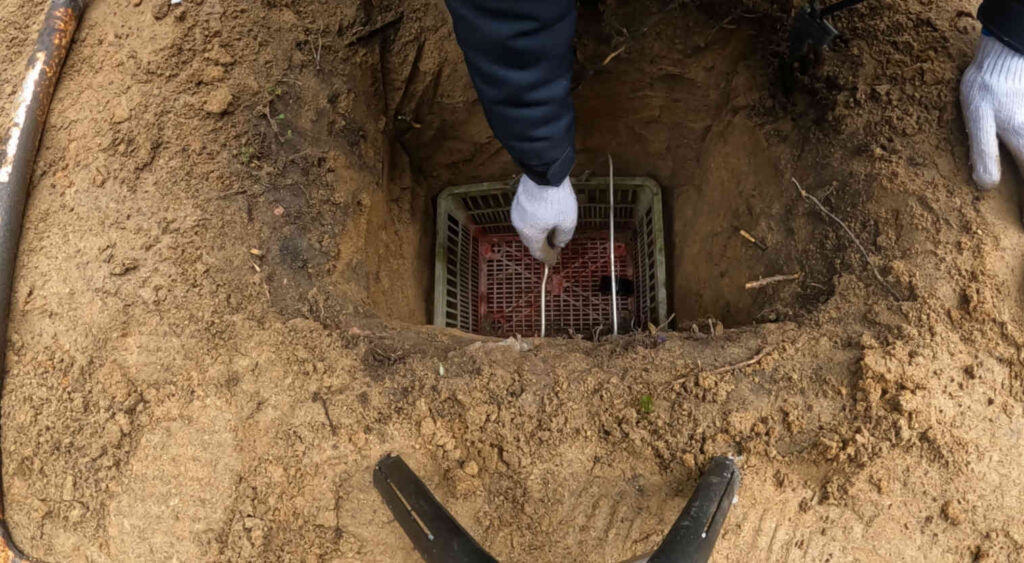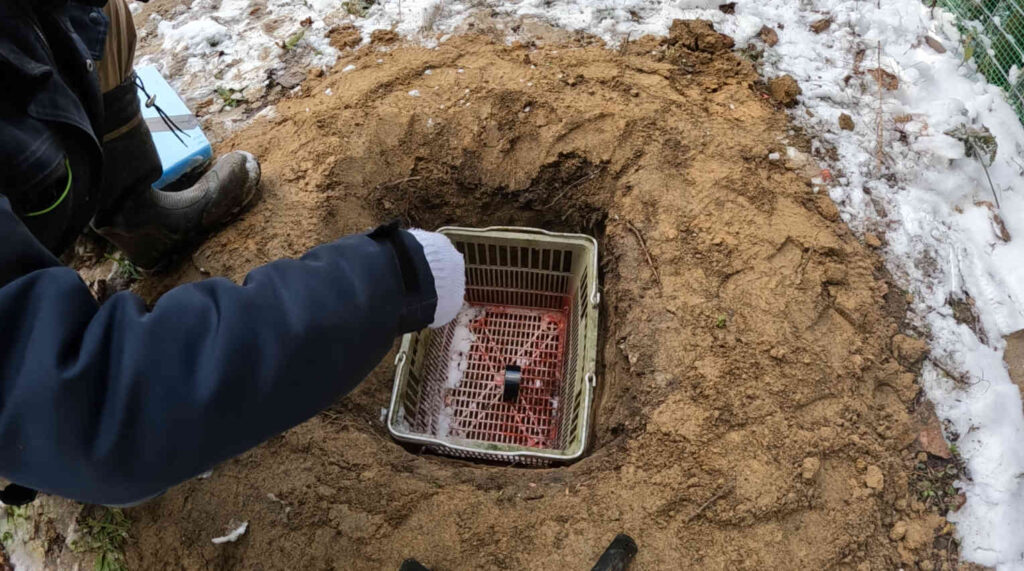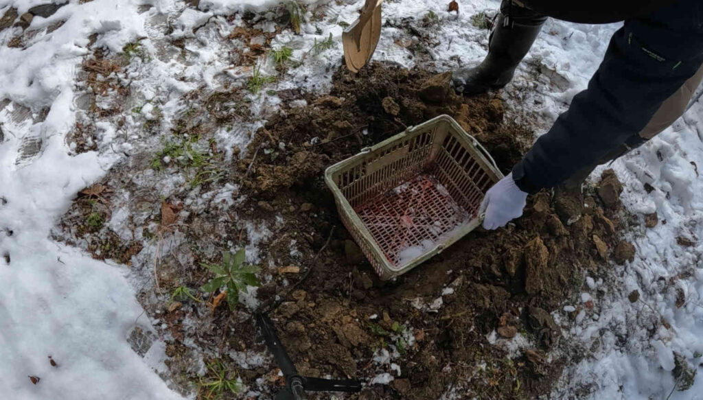 掘りながらカゴと照らし合わせつつ、すっぽりとカゴが収まるまで掘っていきます。