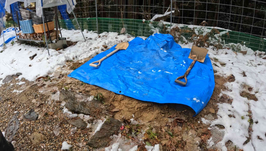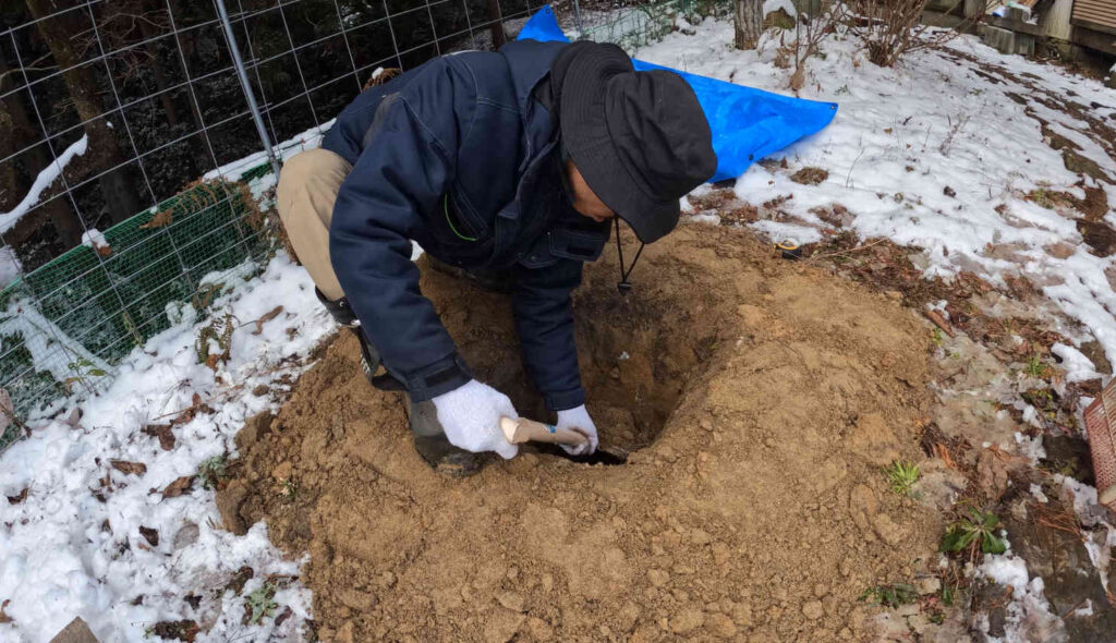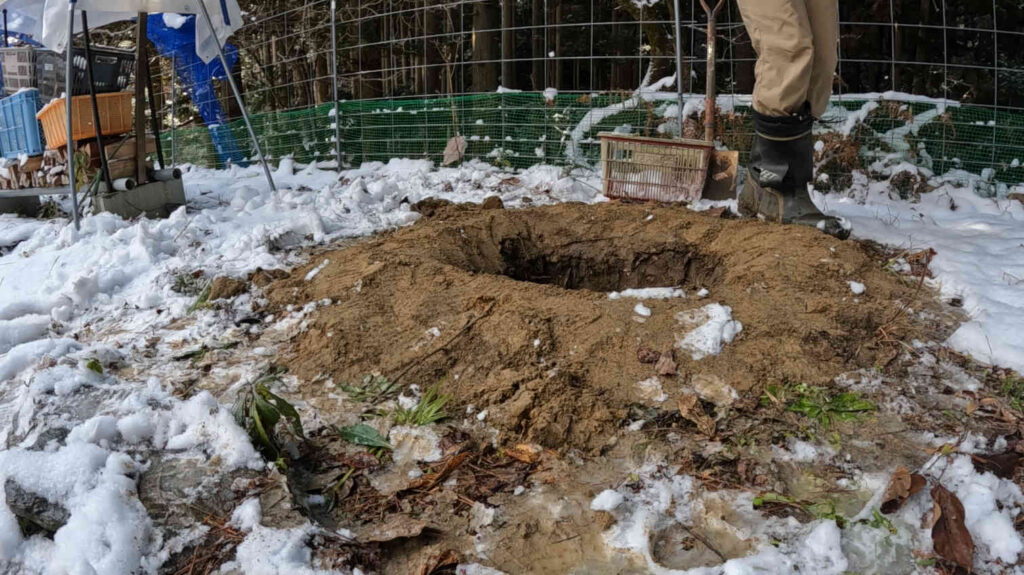 結構ごっつい穴を掘るので、庭に掘るのはちょっとためらいがあったのですが、農地に掘ると獣に掘り返されるのが怖かったんですよね。