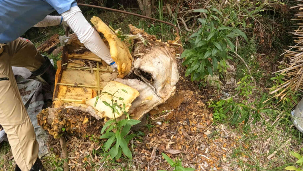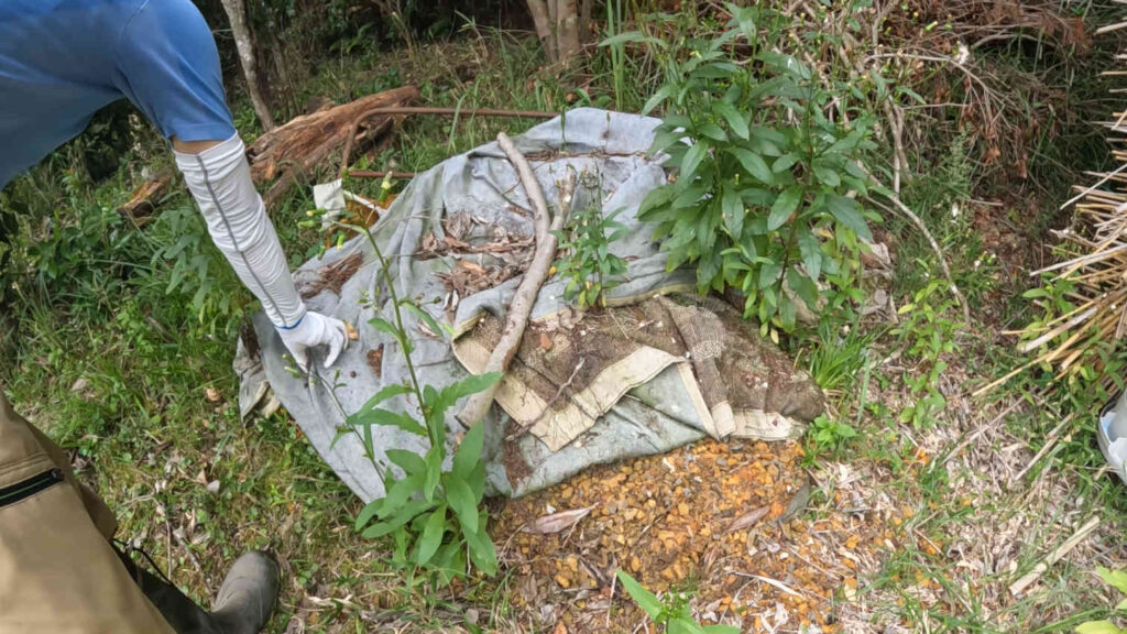 夏の間はマダニがうようよ纏わりついている可能性があったためうかつに手を出せなかったのですが、最近涼しくなってきてマダニも大人しくなってきたので、解体処分がてらなかの骨組みパイプを回収していきます。