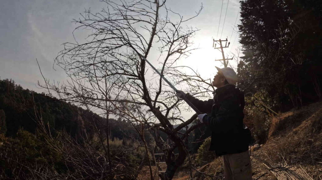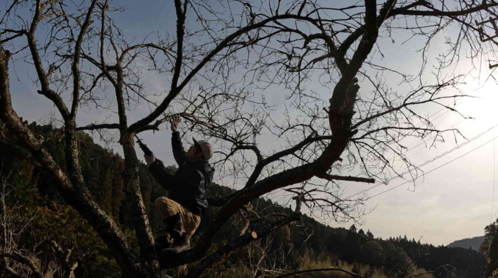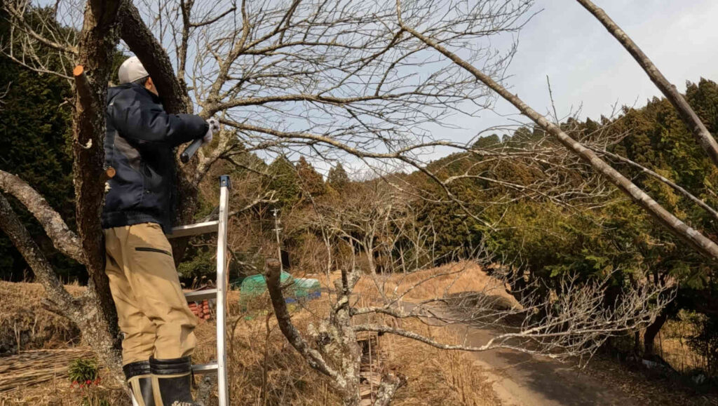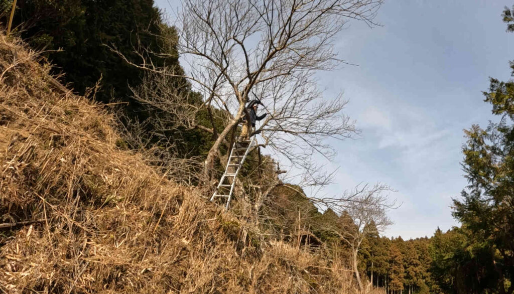 高い位置の枝を切るためには木の上に登る必要がありますが、普通に木の幹に脚をかけて登るのは、ウメの木がかなり古いことも危険なので、梯子を幹にかけてそこに登って剪定をしていきました。