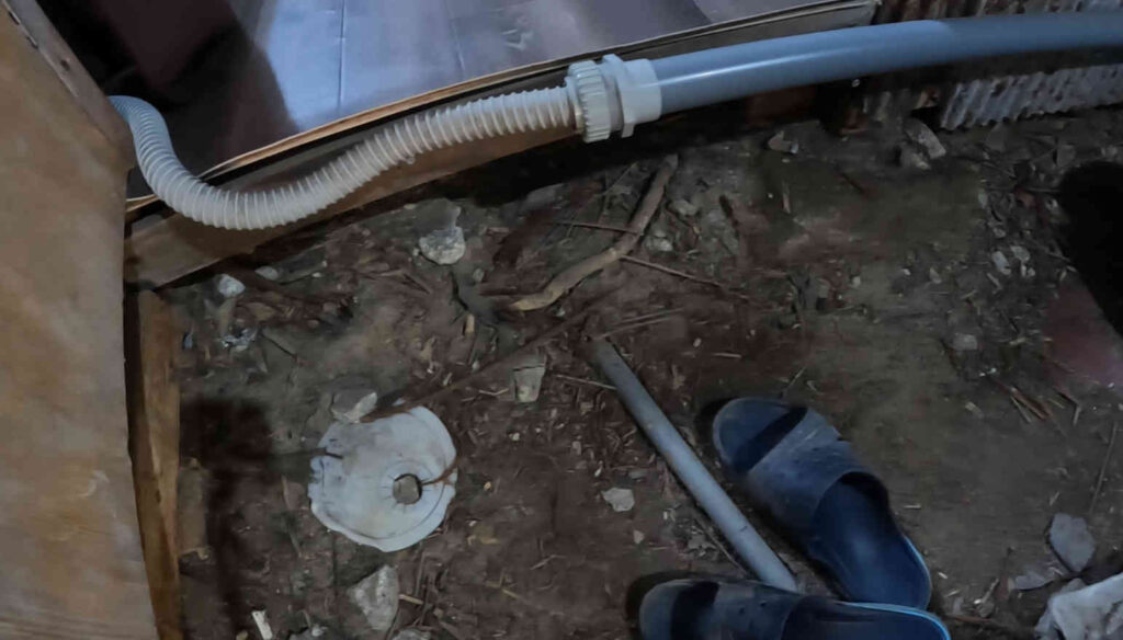 途中、空き家から延びているパイプとの接続部分が折れてしまっているのを発見しました。