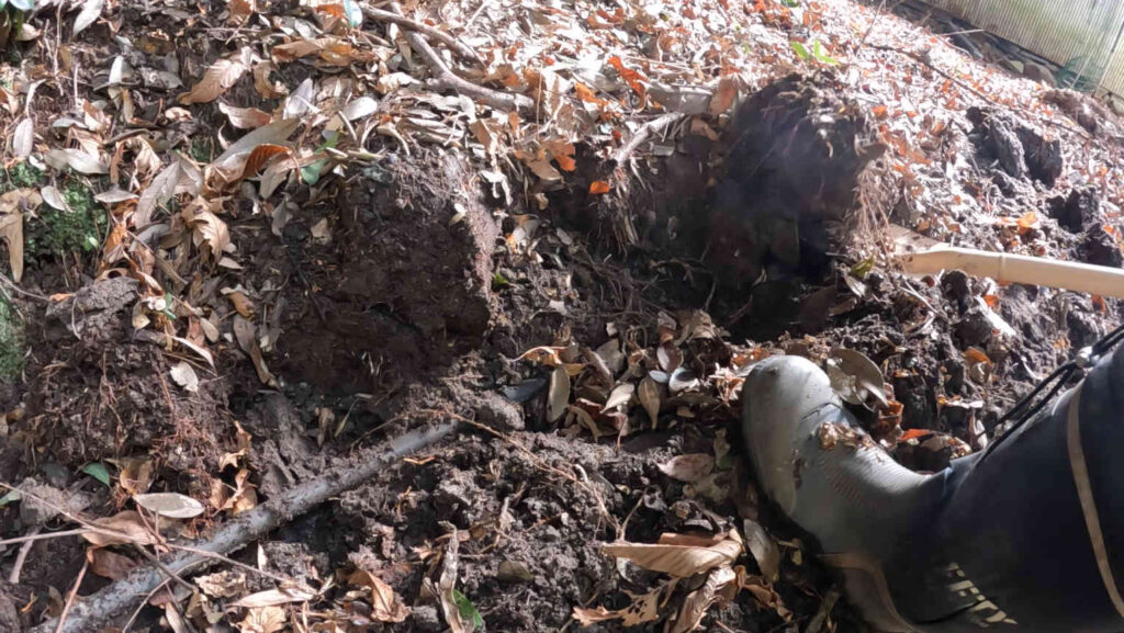 地面自体は、特に草が繁茂しているということも無くかなりふかふかで掘りやすいのですが、塩ビパイプがかなり下に埋まっているので掘り返すのは結構大変です。