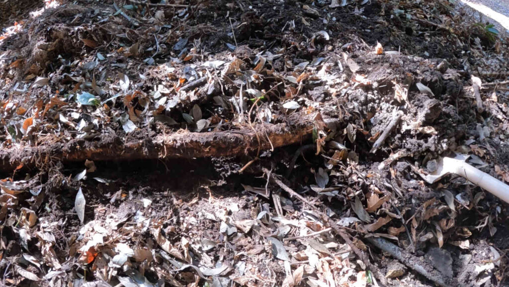 わざわざ塩ビパイプをこの木の下を通るように設置したとは考えにくいので、恐らくは塩ビパイプが設置されたのが相当昔で、その上に土が降り積もって更に木の根っこが植えに伸びたということなのでしょう。