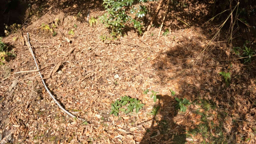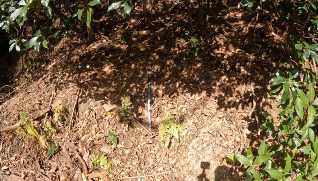 なので今回は、前回発掘した方とは逆方向の、山に向かって伸びている塩ビパイプの方を発掘して正体を確認していきたいと思います。
