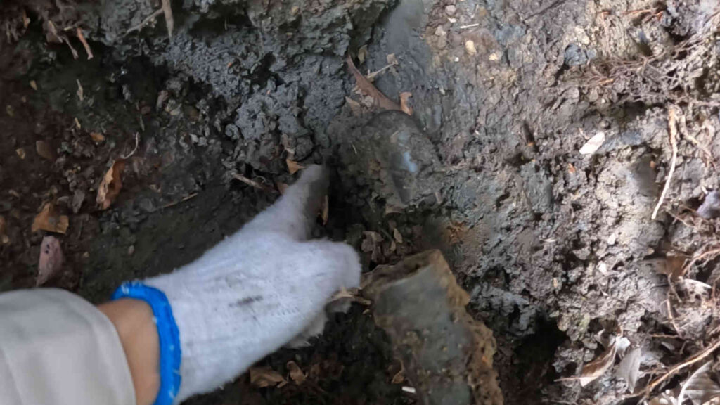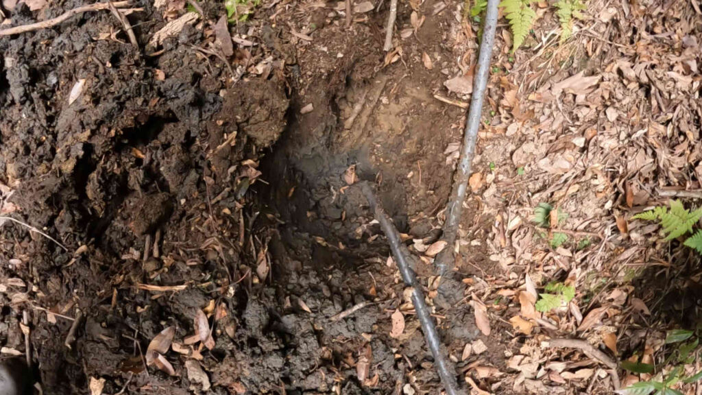 それでも、パイプの伸びている方向を確認しつつ掘り進めていくと、山の斜面に露出していたパイプの方へとどんどん伸びて行っていたので、ちゃんとこちらもイメージ通りパイプがつながっている物と思ったのですが……