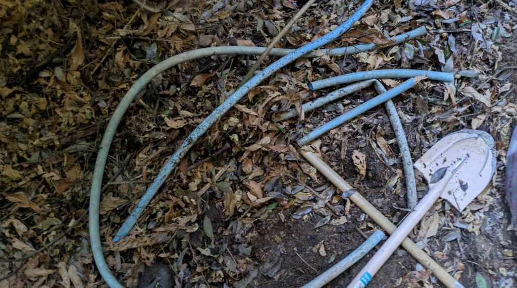 劣化してホースの柔軟性が失われていたのを利用し、鍬で思いっ切り振り下ろして破壊することにしました。