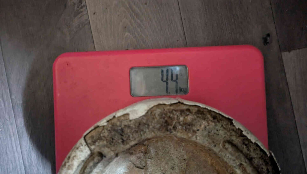 重さは約3.7kg。劣化で外装が剥がれたりしているので、元も重さは4kgと言ったところでしょうか(体重計は壊れているので-0.7gします)。